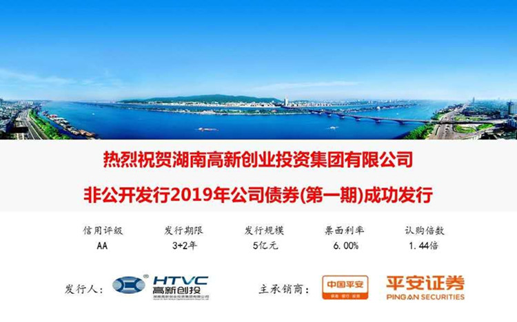在省國(guó)資委的大力支持下,經(jīng)各方努力,歷時(shí)8個(gè)月的籌備,湖南高新創(chuàng)業(yè)投資集團(tuán)有限公司非公開(kāi)發(fā)行2019年公司債券于2019年3月1日成功發(fā)行。發(fā)行總規(guī)模為10億元,此次第一期發(fā)行規(guī)模為5億元,向合格投資者非公開(kāi)發(fā)行,由平安證券股份有限公司承銷(xiāo),期限3+2年,發(fā)行主體信用等級(jí)為AA,認(rèn)購(gòu)倍數(shù)1.44,債券票面年利率為6%,低于湖南省近三個(gè)月同信用級(jí)別、同年限債務(wù)融資工具的發(fā)行利率50-150個(gè)BP。