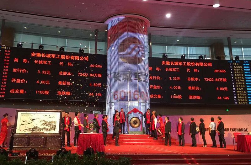 2018年8月6日,安徽長(zhǎng)城軍工股份有限公司(股票名稱為“長(zhǎng)城軍工”,股票代碼601606)在上海證券交易所正式掛牌上市,成為全國(guó)首家以軍品彈藥武器裝備為主營(yíng)業(yè)務(wù)上市的企業(yè)。