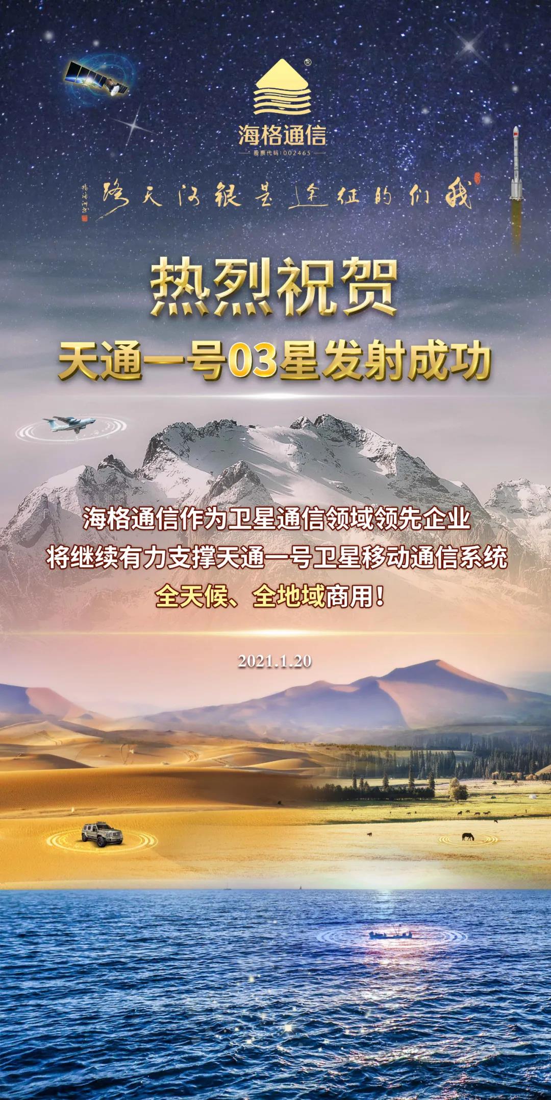 熱烈祝賀天通一號03星發(fā)射成功 海格通信將有力支撐天通一號商用!