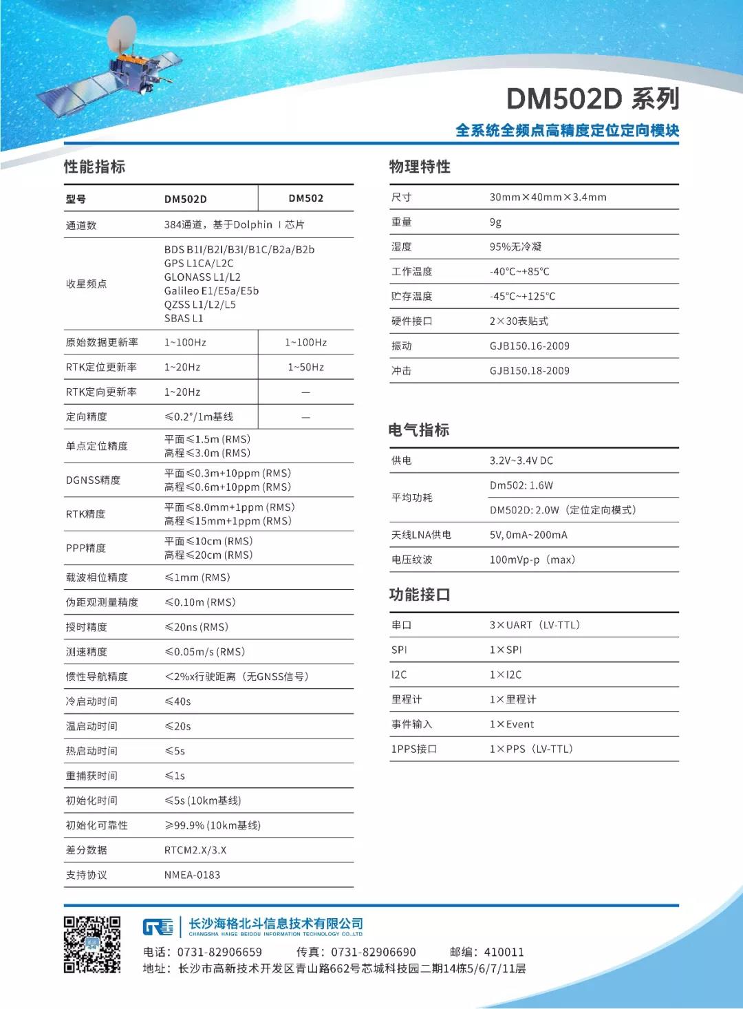 DM502D、DB503D是基于我司自主研發(fā)的北斗三號高精度衛(wèi)星導航基帶芯片“海豚一號”開發(fā)的高精度產(chǎn)品,產(chǎn)品集成了MEMS芯片,有效解決因衛(wèi)星信號失鎖導致的定位中斷等問題,保障了在樓群、隧道和高架等復雜環(huán)境下定位定向輸出的連續(xù)性和可靠性。同時,該產(chǎn)品采用了我司獨創(chuàng)的“海豚音”干擾探測和抑制算法,具備復雜環(huán)境下抗窄帶干擾和抗欺騙干擾能力,實現(xiàn)復雜環(huán)境下連續(xù)有效的定位。產(chǎn)品將運用于駕考駕培、測量測繪、形變監(jiān)測、智能交通、精準農(nóng)業(yè)等行業(yè)。