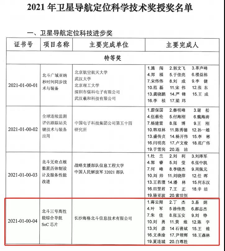 2021年衛(wèi)星導(dǎo)航定位科學(xué)技術(shù)獎評審結(jié)果揭曉,以長沙海格為第一完成單位的“北斗三號高性能綜合導(dǎo)航SoC芯片”項目,獲評2021年度衛(wèi)星導(dǎo)航定位科學(xué)技術(shù)進(jìn)步“特等獎”。