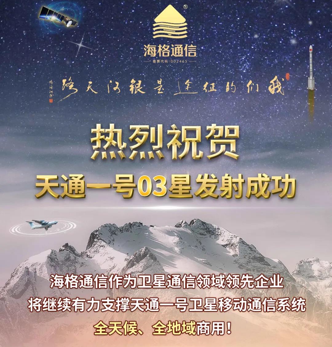 熱烈祝賀天通一號(hào)03星發(fā)射成功 海格通信...