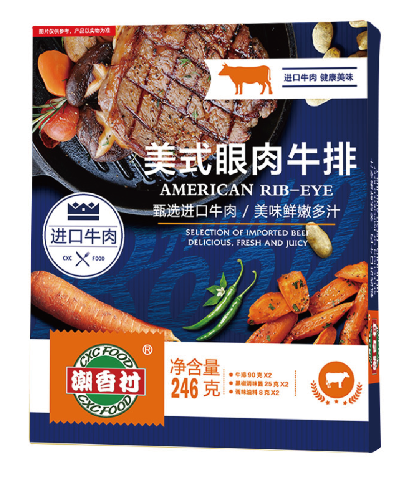 產(chǎn)品介紹:美式眼肉牛排——精選牛只柔嫩部位,油花分布均勻,含有一定肥膘,肥美多汁。潮香村選用優(yōu)質(zhì)健康的進(jìn)口牛肉,肉質(zhì)鮮紅彈嫩,雪花豐富,烹飪后汁水飽滿、味澤鮮嫩,豐富細(xì)膩油花紋理十分豐腴,特別適合油煎,深受食客好評(píng)不斷。