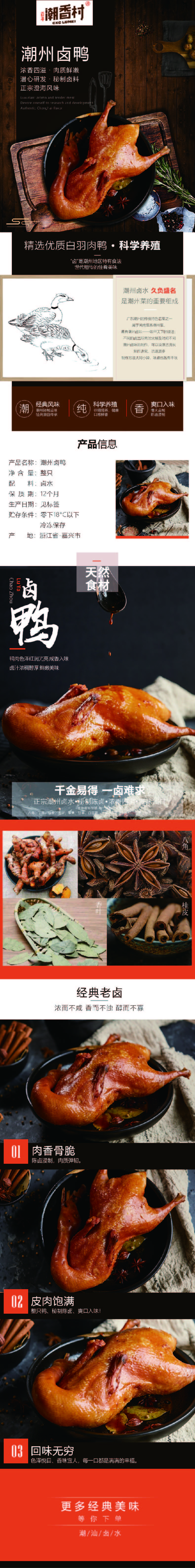 產(chǎn)品介紹:潮州鹵鴨——潮香村做的鹵鴨,只用新鮮鴨,拒絕冰凍鴨,自然散養(yǎng)的白羽肉鴨,皮薄肉瘦,光看著就覺得美味可口~配上絕不外傳的秘制鹵水配方,每一滴都是精華,鹵制以后,味道香醇撩人。 感受一只鴨的百般嫵媚。